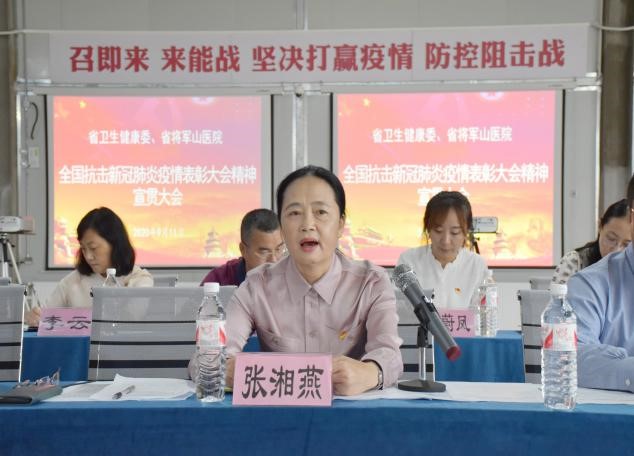 张湘燕与参会人员一起分享了此次代表省将军山医院到北京领取“全国抗击新冠肺炎疫情先进集体”“全国抗击新冠肺炎先进基层党组织”荣誉,参加全国抗击新冠肺炎疫情表彰大会的感言。她表示,要深入学习贯彻习近平总书记在全国抗击新冠肺炎疫情表彰大会的讲话精神,继续将省将军山医院这个全省新冠肺炎患者集中救治医院建设好,坚决做好疫情防控常态化值守工作,为全省经济社会发展做出更大的贡献。省将军山医院荣获“全国抗击新冠肺炎疫情先进集体”“全国抗击新冠肺炎疫情先进基层党组织”,这些成绩的取得,得益于省委、省政府的科学决策部署,得益于省卫生健康委党组的精心指导,得益于省将军山医院全体同志艰苦卓绝的努力,是全省医疗卫生系统共同的荣誉,是全省医务人员勇挑重担的体现。