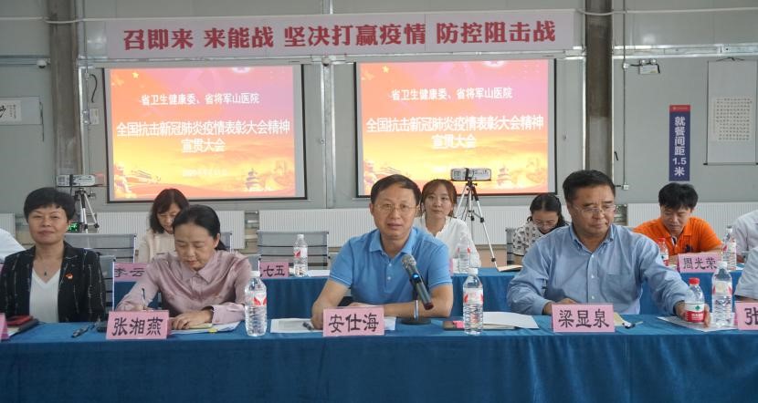 9月11日,贵州省将军山医院召开全国抗击新冠肺炎疫情表彰大会精神宣贯会议。省卫生健康委党组成员、副主任、省新冠肺炎医疗救治组组长、原省将军山医院管理工作组组长安仕海,省人民医院党委书记、省级新冠肺炎救治专家组组长、省将军山医院临时党委书记、原省将军山医院管理工作组组长张湘燕,省疾控中心党委书记、原省将军山医院管理工作组副组长、原省级集中救治点大水沟院区(现省将军山医院)临时党委书记陈霏出席会议。会上,安仕海、张湘燕、陈霏等同志满怀深情地向大家分享了本人在省将军山医院抗疫的战斗历程、抗疫感人故事和亲身感悟。