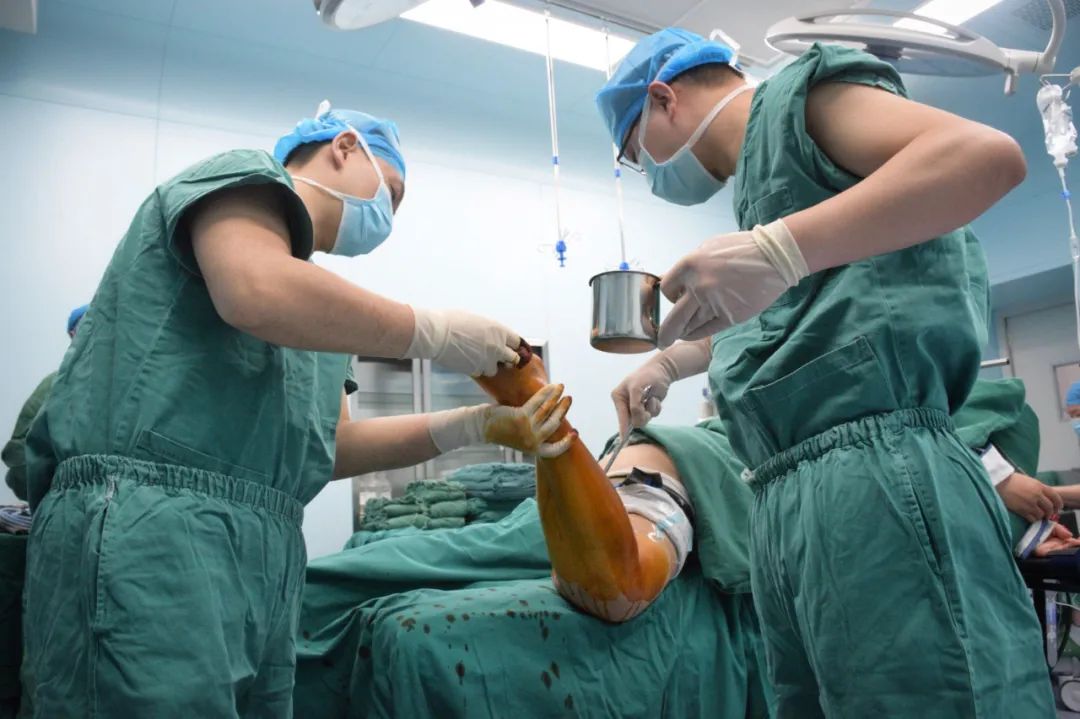右侧踝关节清理、外侧韧带修补重建及筋膜清理术,图为医生正在为患者手术部位进行消毒
