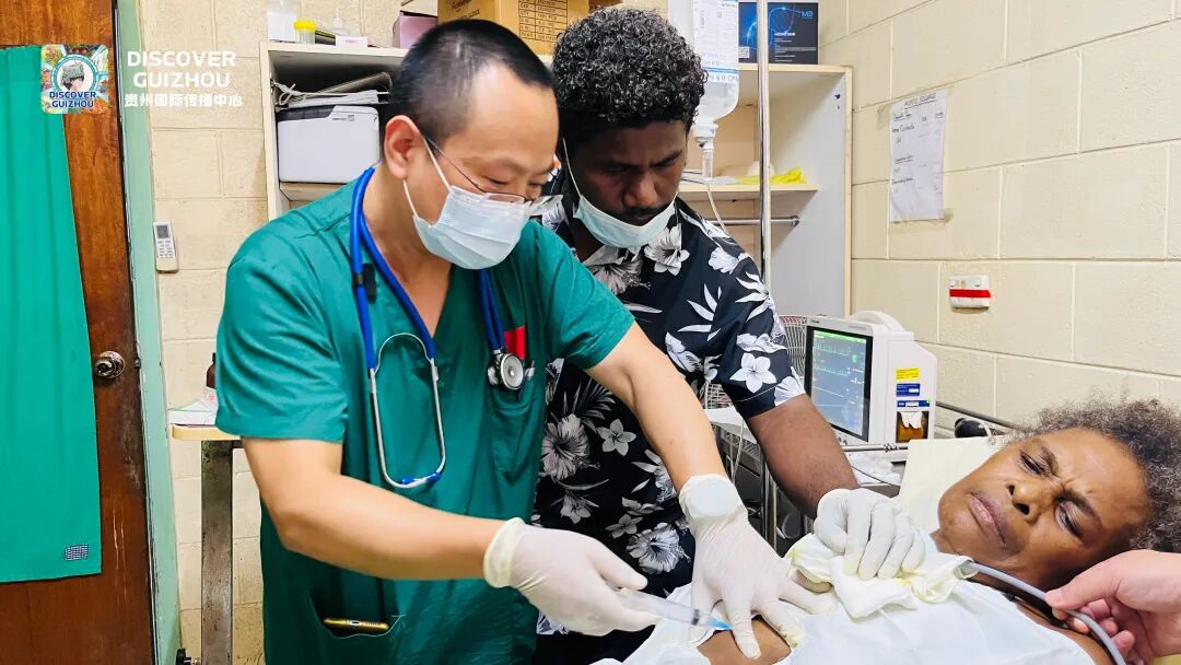 第三批援所罗门群岛中国医疗队队员、贵州医科大学附属医院心脏功能监察室主任韦波为当地病人开展心包穿刺手术