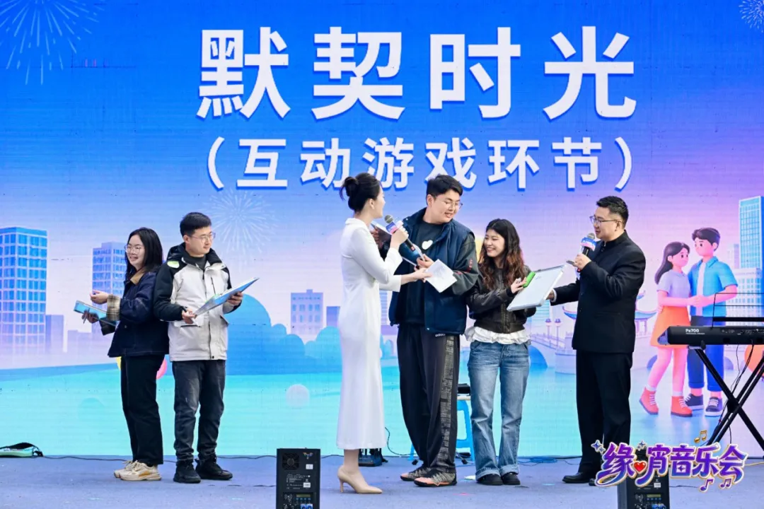 随后,“缘”宵音乐会正式开唱,分为心动邂逅、甜蜜承诺、温暖相伴三个篇章,乐队倾情演唱多首经典情歌,浪漫旋律萦绕全场。互动环节中,单身青年登台参与心动配对,勇敢表达心意;情侣、夫妻组队开展“育见美好”挑战,趣味比拼充满生活气息;夫妻搭档参与“默契时光”考验,走心告白让现场暖意浓浓。三轮婚育政策与元宵趣味结合的有奖竞答穿插其中,市民踊跃参与,在欢声笑语中学习婚育知识,收获精美礼品。