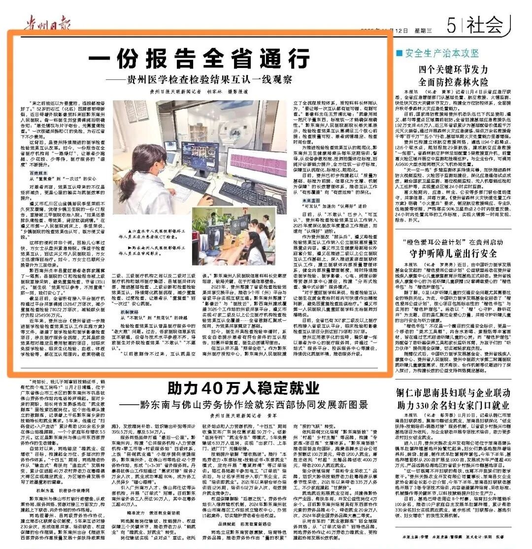 11月12日,《贵州日报》第五版发布标题为《一份报告全省通行——贵州医学检查检验结果互认一线观察》文章,关注我省近年来出台《贵州省进一步推进医学检验检查结果互认工作实施方案》等文件,明确在二级、三级医疗机构之间以及二级对三级医疗机构和城市医疗集团、县域医共体内部,推进基层检查、上级诊断和检查检验结果互认,持续简化就医流程,减少重复检查、过度检查,让患者从“重复查”到“一次过”安心就医。具体报道如下: