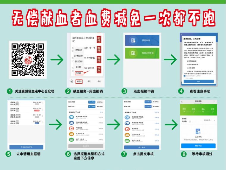 在全省统筹推进下,贵州省血液中心于2024年10月与国家电子献血证平台完成联网,接收献血者血费减免线上办理申请;并于今年3月上线了“贵阳市血费减免直报平台”,目前可以通过“全国电子献血证”平台、医疗机构直报平台、贵州省血液中心微信端办理,三个渠道均是实现献血者“血费减免一次都不跑”的有效途径。