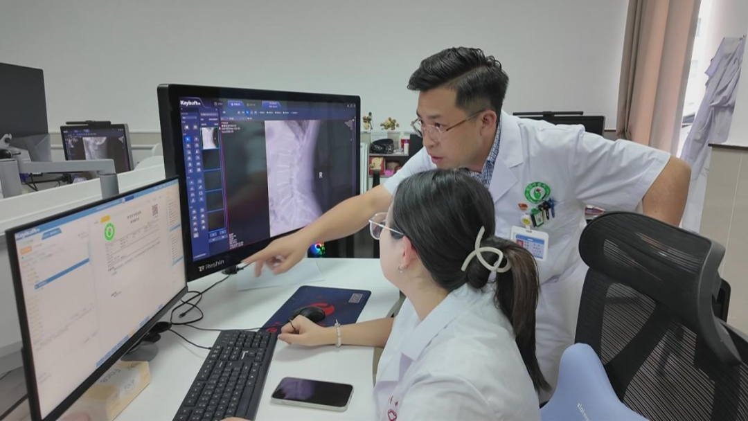 毕节市中医医院放射科副主任余浪与科室同事检查影像设备检查精准度