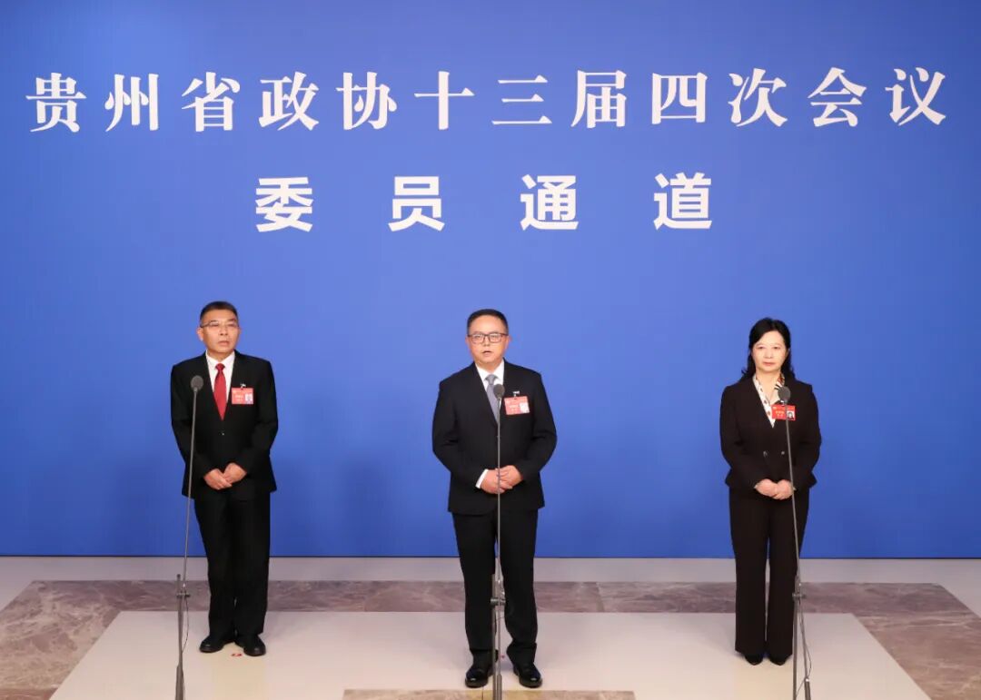 高鸿(中)在贵州省政协十三届四次会议第二场“委员通道”集体采访活动上接受采访
