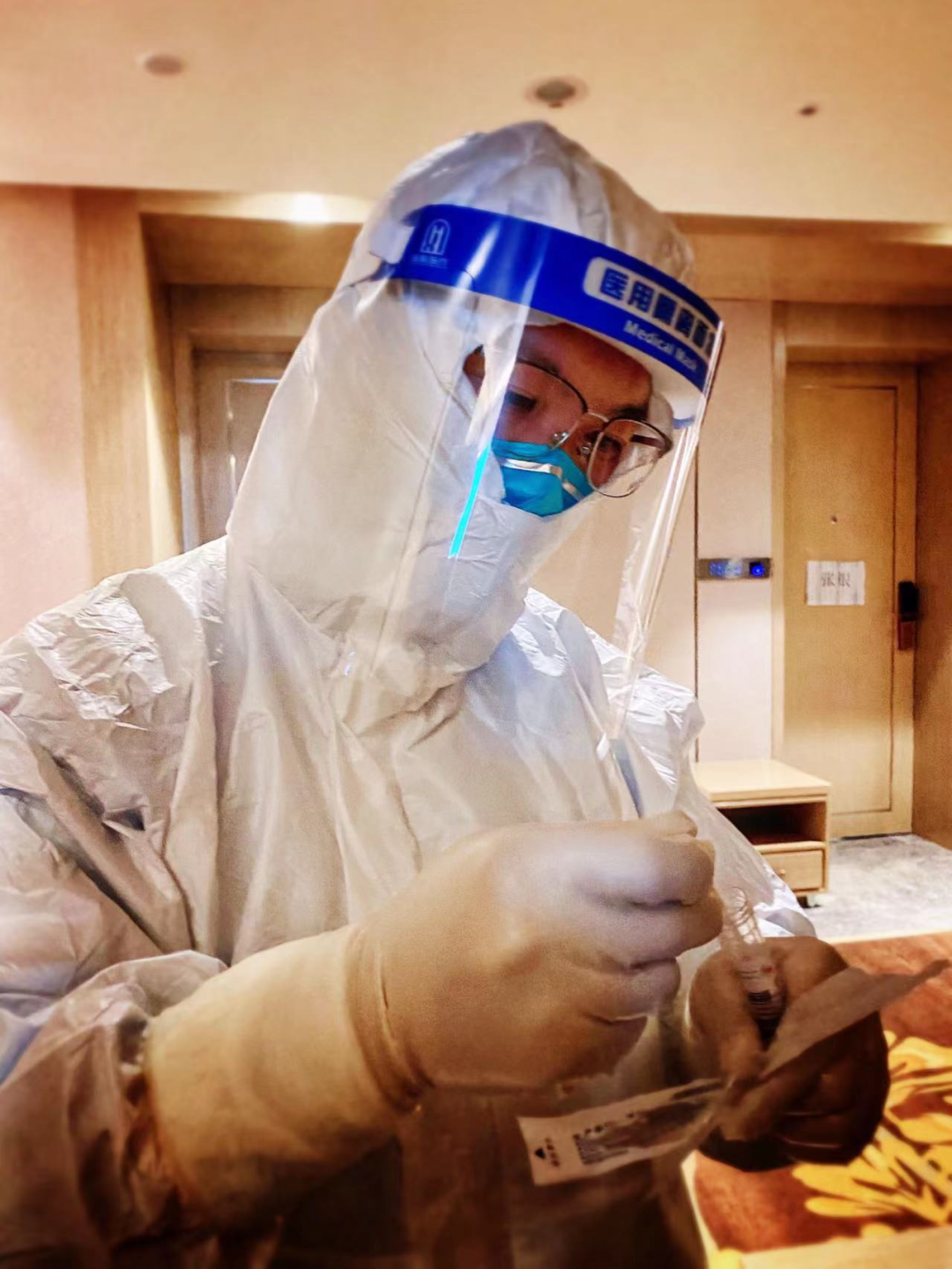 去年的2月3日,作为首批隔离酒店驻点医生的杨通华就是在这家隔离酒店的工作岗位上完成了神圣的入党宣誓,铮铮誓言犹在耳旁,此次再战“疫”线,他还是主动负责起观察区医疗服务工作,每天穿着笨重的防护服测体温、测血糖、量血压、采核酸、紧急医疗服务.......,这次隔离人员几乎都是老年人,大都患有基础疾病。杨通华更加悉心耐心,哪一个房间的哪一位老人有高血压,哪一位有糖尿病、哪一位需要常备心脏急救药物,他都了然于心,每班加强监测和巡查,治疗方案及时跟进调整,他始终以一名共产党员的高度自觉,扎根隔离酒店,以专业、用心、用情守护着酒店内的健康平安。