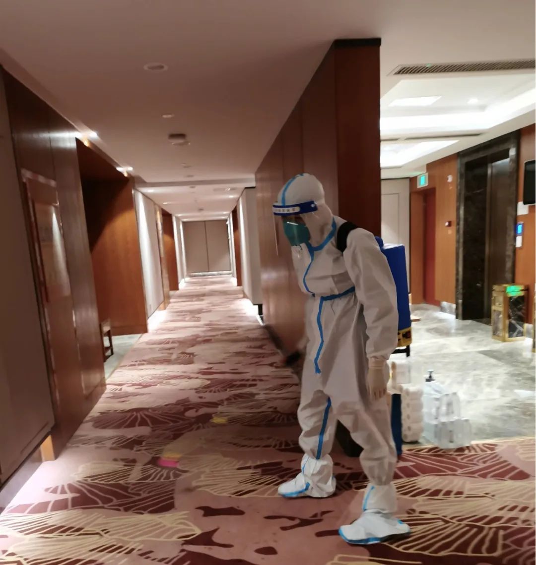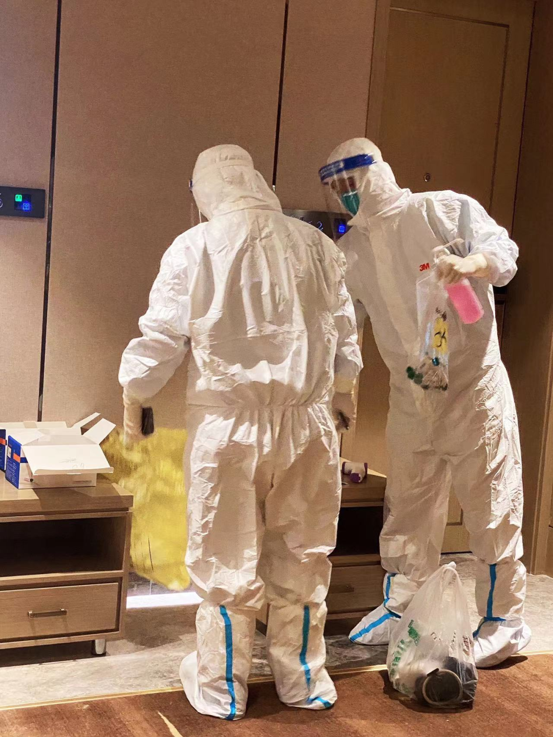 进驻酒店当日,身为白云区感控专家的周云飞便马不停蹄,协调现场医疗服务和防控任务,积极配合省、市疾控专家根据酒店的内部结构、周边环境、风险差别情况开展酒店现场功能区域划分;规范“两通道”设置;规范采样流程,开展环境监测;规范隔离酒店内各类人员管理,张贴醒目标志标识;指导消毒净化......建好隔离点疫情防控“防火墙”,织密隔离点医疗服务“服务网”,为集中隔离医学观察工作夯实感控基础。