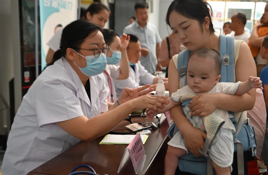 7月1日一早,从江县人民医院门诊大厅一楼,不少家长抱着孩子,不时回答儿科专家的询问,认真听着他们的叮嘱。