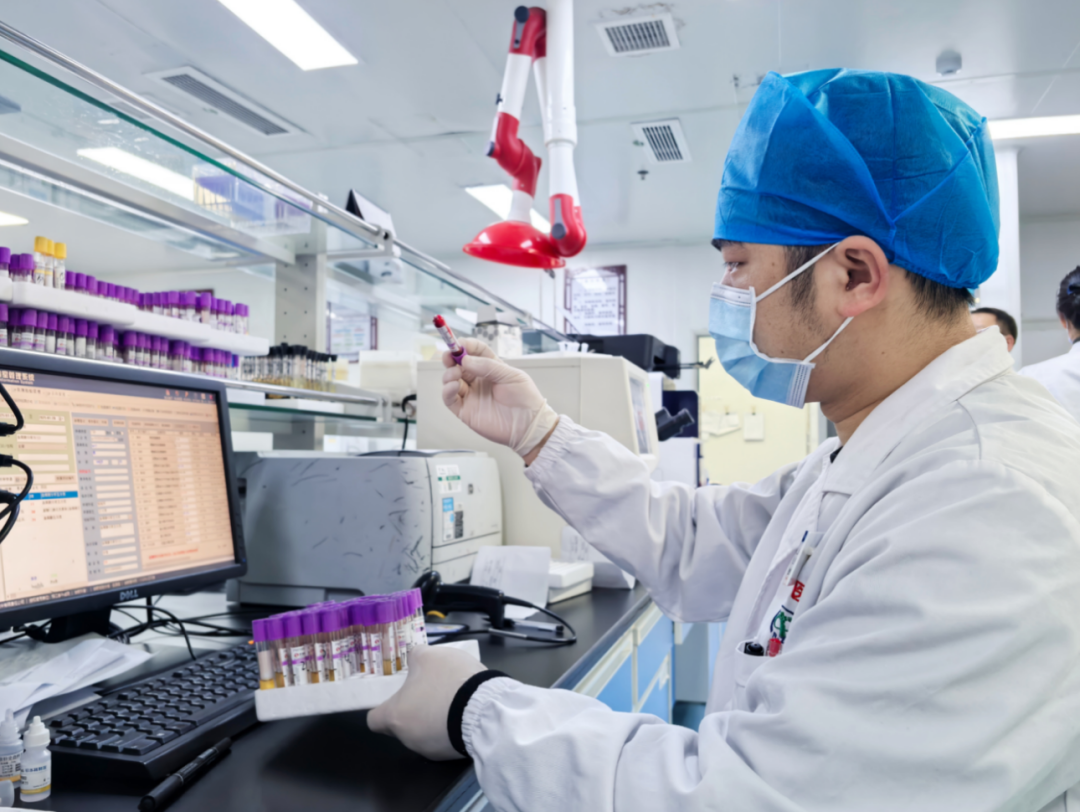 榕江县中医院检验人员在校对检验试剂。(榕江县中医院 赖如希)