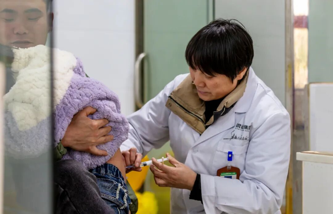 村医谢厚芝在黔西市林泉镇海子社区卫生室为就诊小朋友注射针剂