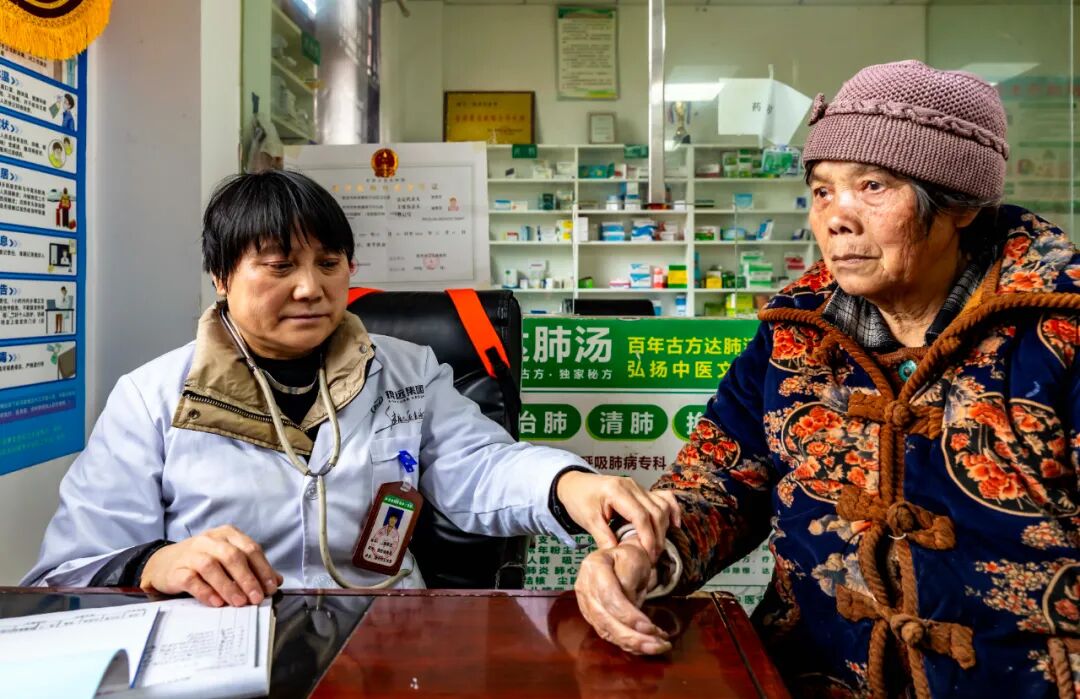 村医谢厚芝在黔西市林泉镇海子社区卫生室为群众把脉诊断