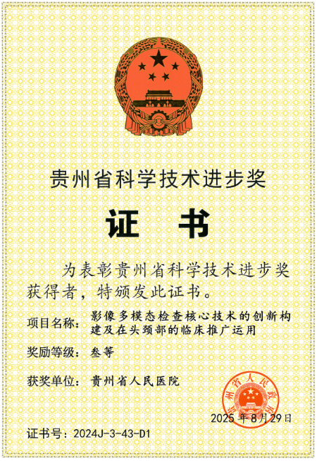 近日,由贵州省人民医院与中国人民解放军陆军军医大学第一附属医院合作完成的《影像多模态检查核心技术的创新构建及在头颈部的临床推广运用》项目,荣获贵州省科学技术进步奖三等奖。