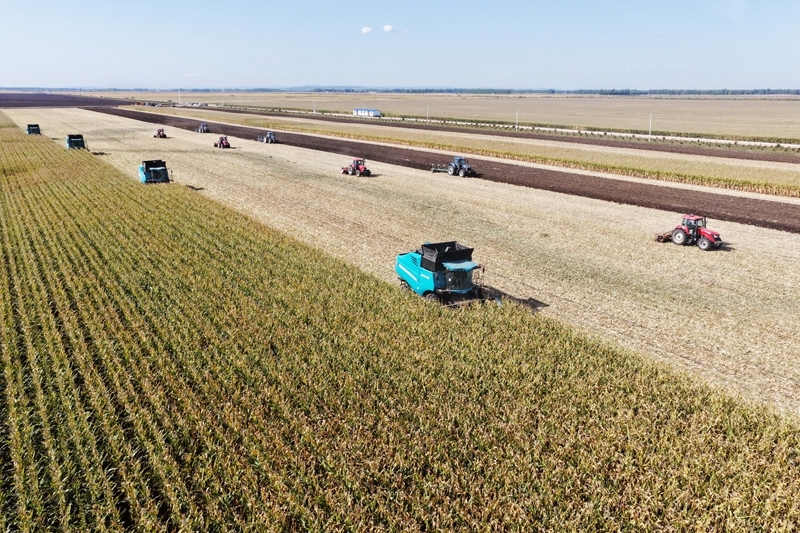 2025年9月23日,在位于双鸭山市的黑龙江北大荒农业股份有限公司友谊分公司一旱田地块,大型农业机械在进行玉米收获作业(无人机照片)。新华社记者 王松 摄